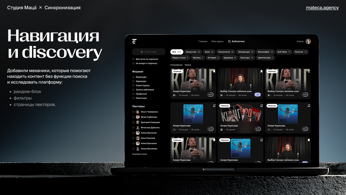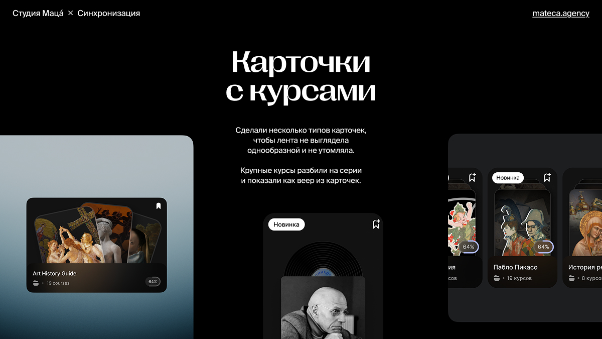«Синхронизация» — образовательная платформа, в которой можно найти курсы про искусство, кино, музыку, литературу, психологию и даже вино. У компании больше 100 курсов по 20 направлениям, 157 тысяч слушателей, а сама платформа существует уже 6 лет.