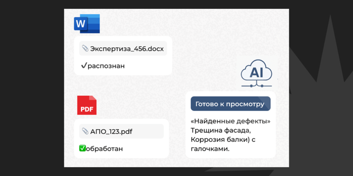 Мы внедрили ИИ-агента, который берёт на себя полный цикл обработки АПО и экспертиз девелопера. Агент распознаёт загруженные документы (Word и сканы), приводит данные к единому формату и автоматически классифицирует дефекты и виды работ по справочникам.