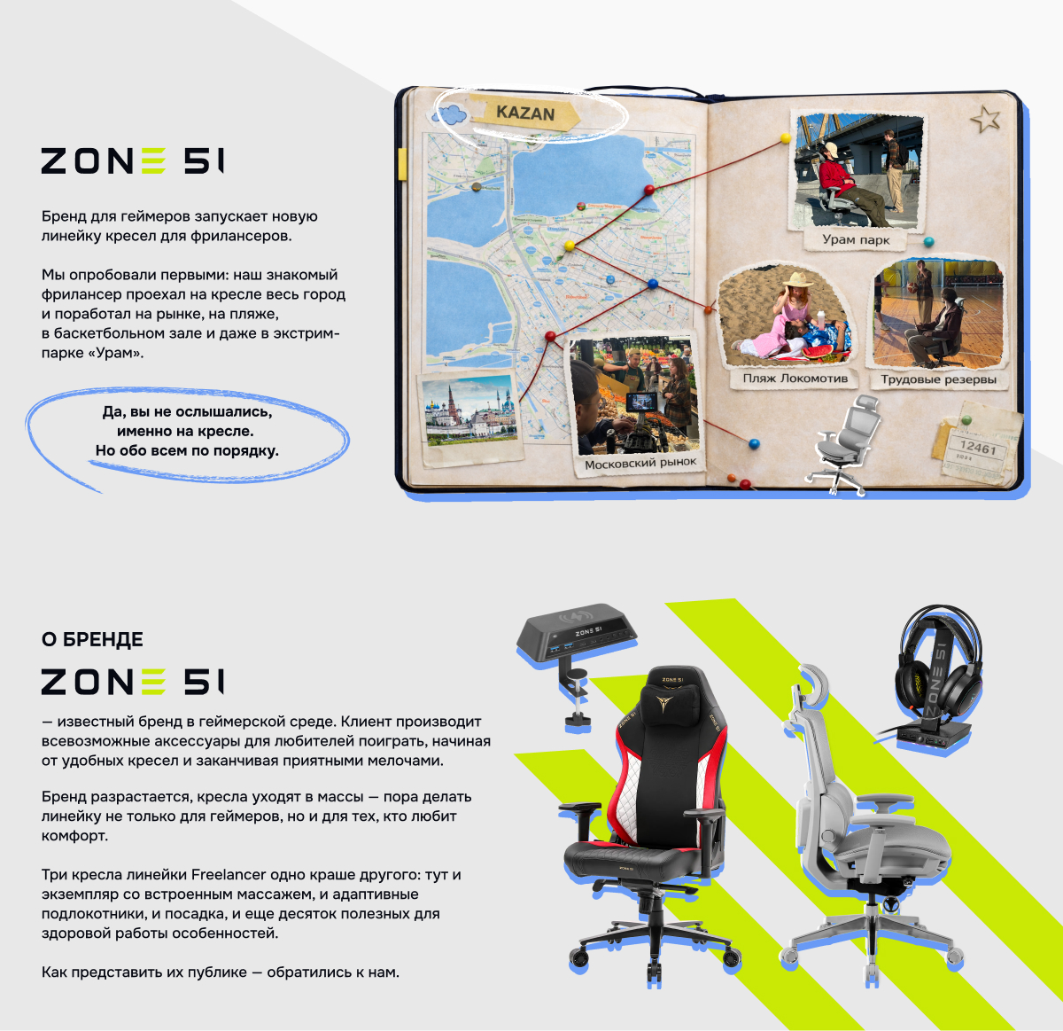 Контекст: Бренд ZONE51 — бренд в геймерской среде, известный своими смелыми маркетинговыми решениями. Задача состояла в запуске новой флагманской линейки кресел Freelancer, созданной не только для геймеров, но и для широкой аудитории — тех, кто ценит комфорт при долгой работе.