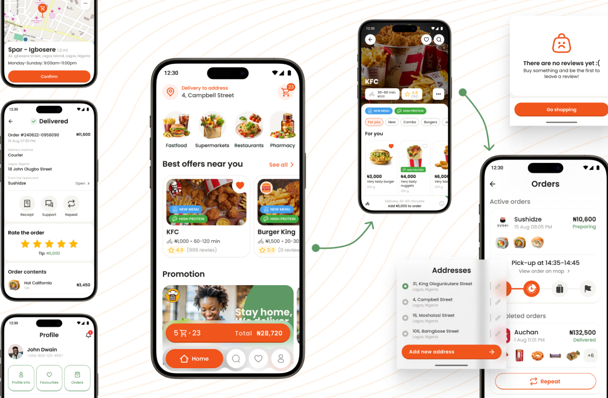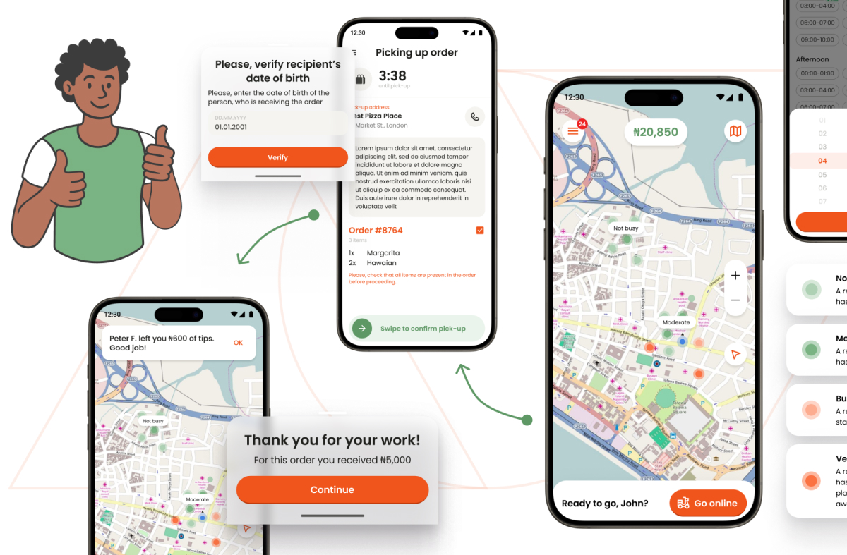 Ключевым решением стал подход, при котором основным устройством является мобильный телефон. Для курьеров мобильное приложение — основной рабочий инструмент, поэтому интерфейс сделали максимально простым и устойчивым к нестабильному интернету. Параллельно запустили веб-кабинет для бизнеса, который закрывает базовые задачи онлайн-продаж и управления заказами.