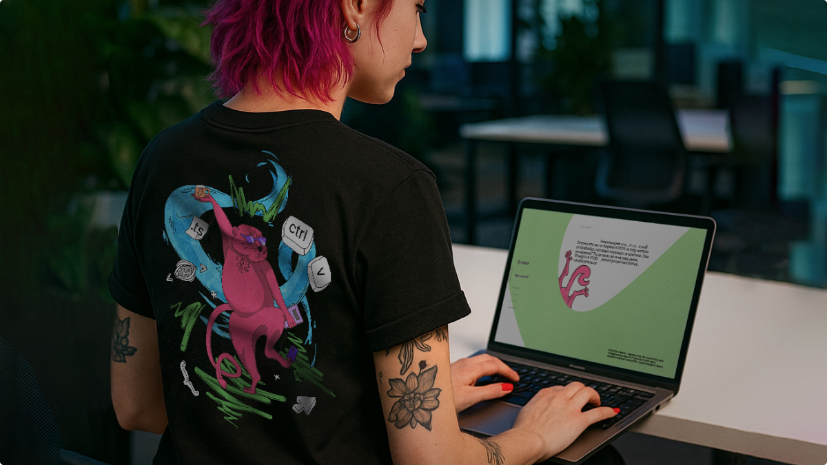 Лендинг отличается нетипичной структурой скролла: пользователь словно перемещается в абсурдном, кислотном пространстве, а динамичные анимации усиливают эффект погружения. В том же стиле мы оформили все анонсы и материалы для соцсетей, дополнив их анимированными элементами.