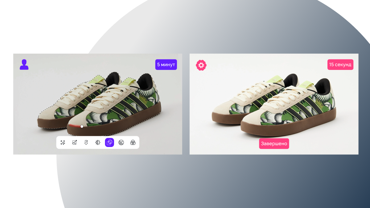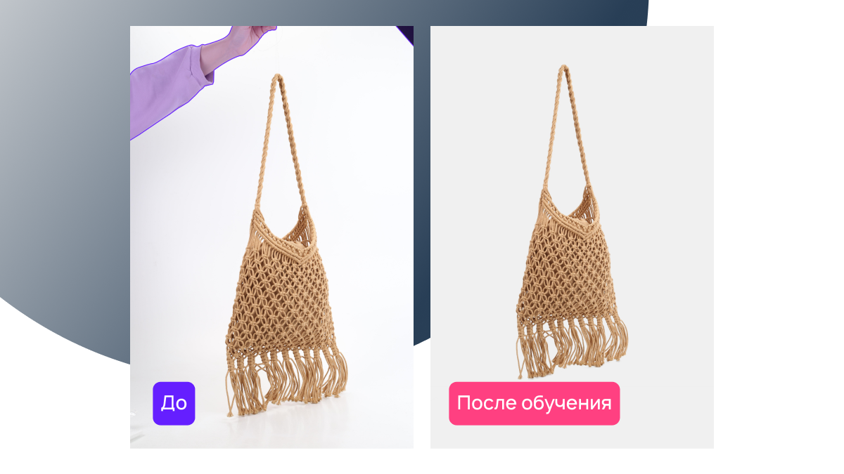 Работа с изображением сумки включает те же этапы, что и обработка фото обуви, но потребовала дополнительной тренировки нейросетевых моделей. Также мы обучили ещё одну AI-модель: она убирает руки из кадра.