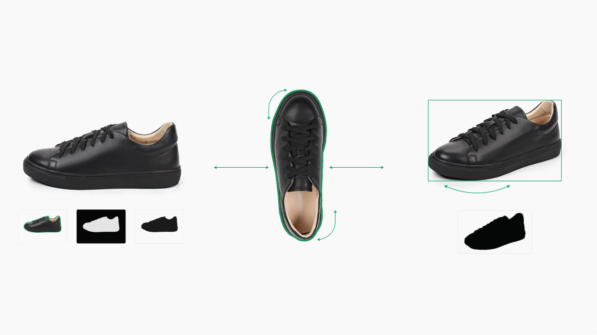 Изображение обуви в профиль загружается в сервис и автоматически обрабатывается нейросетью, которая отделяет объект от фона, добавляя альфа-канал для прозрачности.