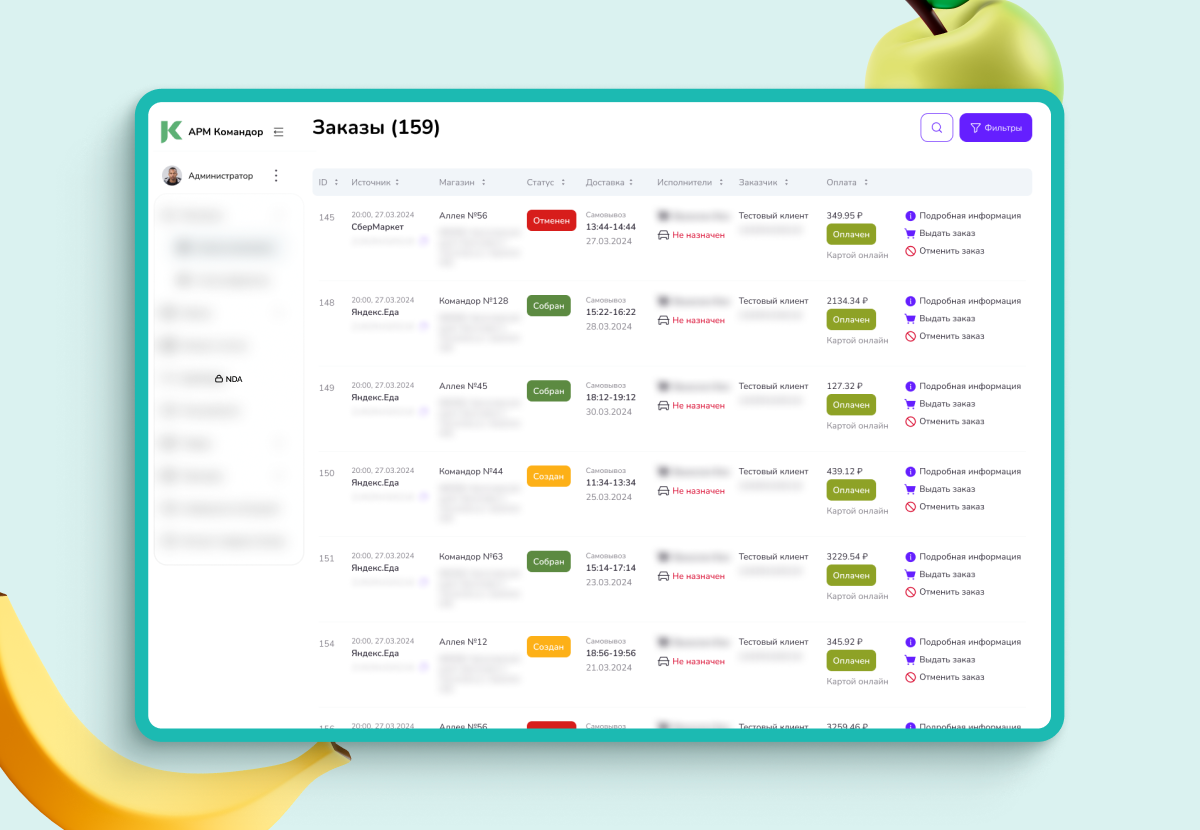Сервис позволил «Командору» реализовать сборку заказов в магазинах — сборщики сети с помощью приложения собирают заказы, супервайзеры с помощью админ-панели руководят процессом. Мы настроили интеграции с Купером и Яндекс.Едой, чтобы получать заказы и из этих сервисов, а также с мобильным приложением «Копилка» — собственной программой лояльности торговой сети «Командор». Автоматизировали обмен и фиксацию статусов в разных учетных системах партнеров ритейлера и курьерских служб.
