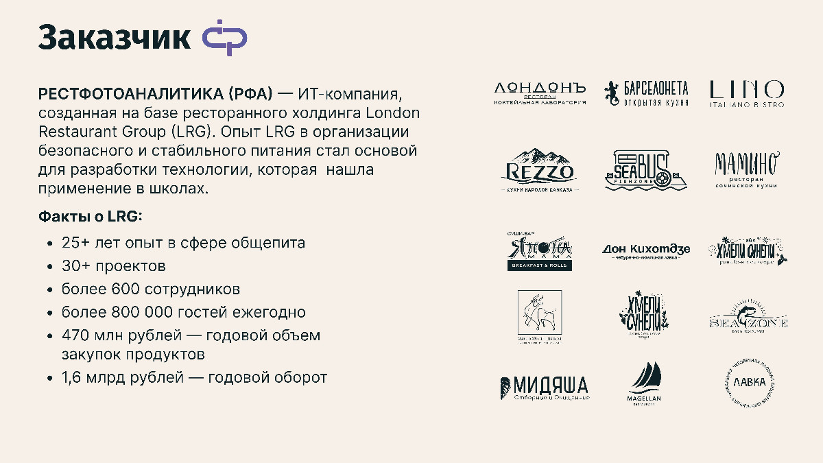 Заказчик — компания «РЕСТФОТОАНАЛИТИКА», которая работает с объектами общественного и социального питания. В своей практике компания регулярно сталкивалась с одними и теми же проблемами: большим объёмом пищевых отходов, неточным учетом и отсутствием прозрачности в списаниях.