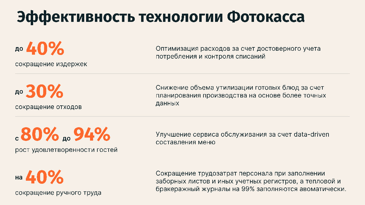 На коммерческих объектах заказчика система показала устойчивые результаты. За счёт точного учета потребления и возвратов удалось сократить избыточные закупки и снизить объём утилизации готовых блюд в среднем на 30%. Оптимизация списаний и контроль фактического потребления позволили снизить операционные расходы до 40%.