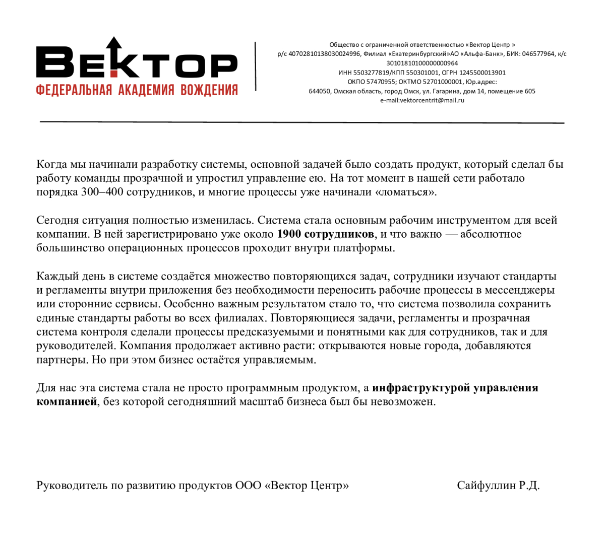 На старте разработки в системе работало порядка 300–400 пользователей. Сегодня в ВекторВнимания зарегистрировано около 1900 человек. Компания открывается в новых городах и продолжает расти, не теряя управляемости и единых стандартов работы.