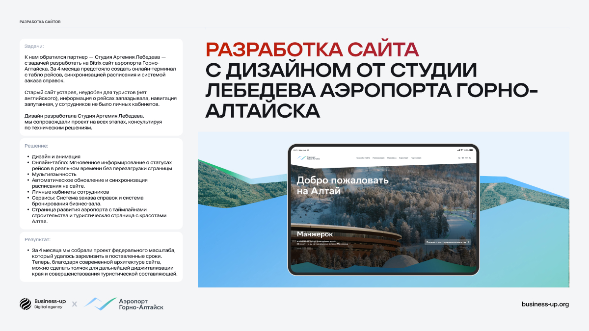 - Запрограммировали сайт Горно-Алтайского Аэропорта с дизайном от Студии Артемия Лебедева;