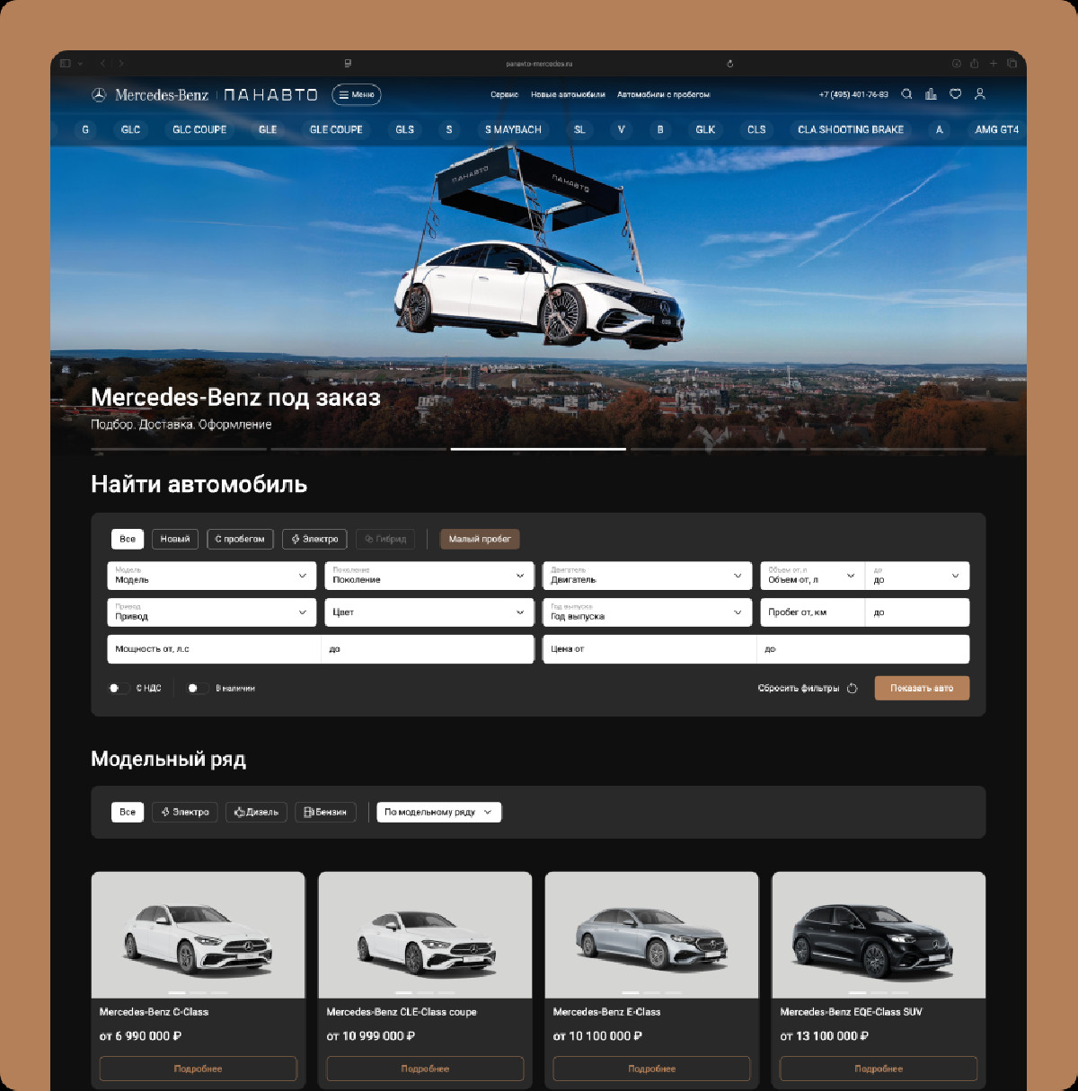 - Жесткие ограничения старой платформы. Прежний сайт функционировал в рамках корпоративных стандартов Mercedes-Benz. Система не позволяла оперативно добавлять новые марки, менять структуру каталогов или адаптировать страницы под требования новых партнеров.