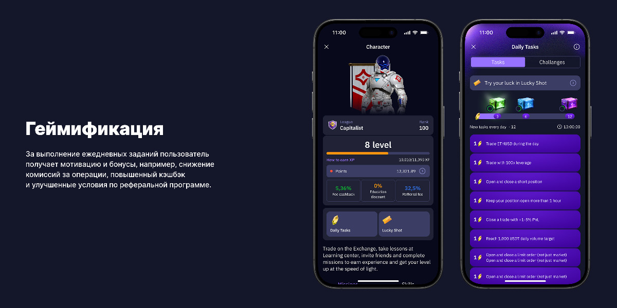 Мы встроили систему ежедневной активности, которая напрямую влияет на поведение пользователей. За выполнение заданий вроде размещения ордеров, закрытия позиций, ежедневный вход пользователь получает практическую выгоду и мотивацию: снижение комиссий за операции, повышенный кэшбэк и улучшенные условия по реферальной программе.