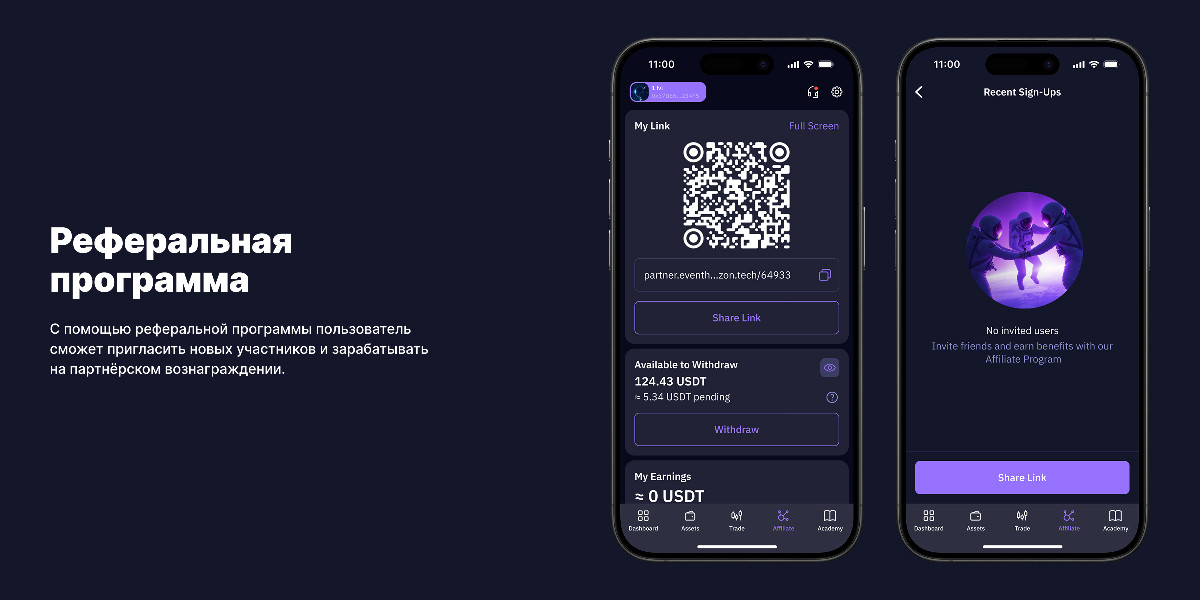 С помощью реферальной программы пользователь может приглашать новых участников и зарабатывать на партнёрском вознаграждении.
