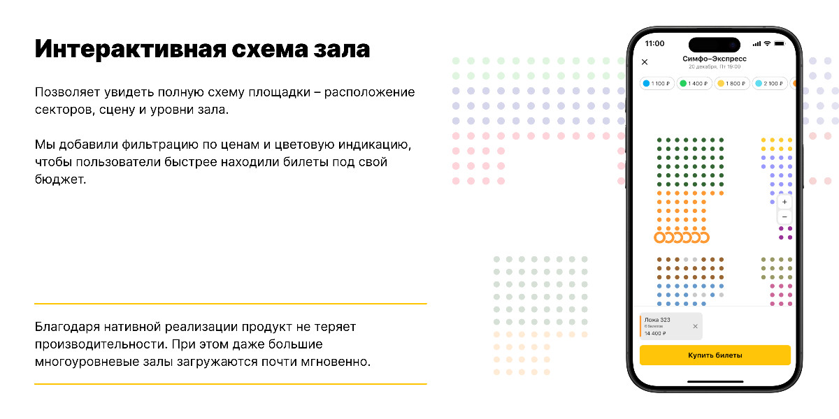 Мы хотели сделать выбор мест не только интуитивно понятным и простым, но и быстрым. Благодаря нативной реализации продукт не теряет производительности – даже большие многоуровневые залы загружаются почти мгновенно.