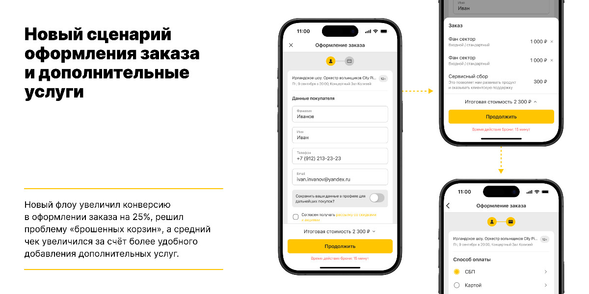 - Ключевым драйвером роста стал новый поэтапный сценарий оформления заказа. Обновлённый флоу увеличил относительную конверсию в оформлении заказа +25%, снизил долю «брошенных корзин» и привёл к росту среднего чека за счёт более удобного добавления дополнительных услуг.