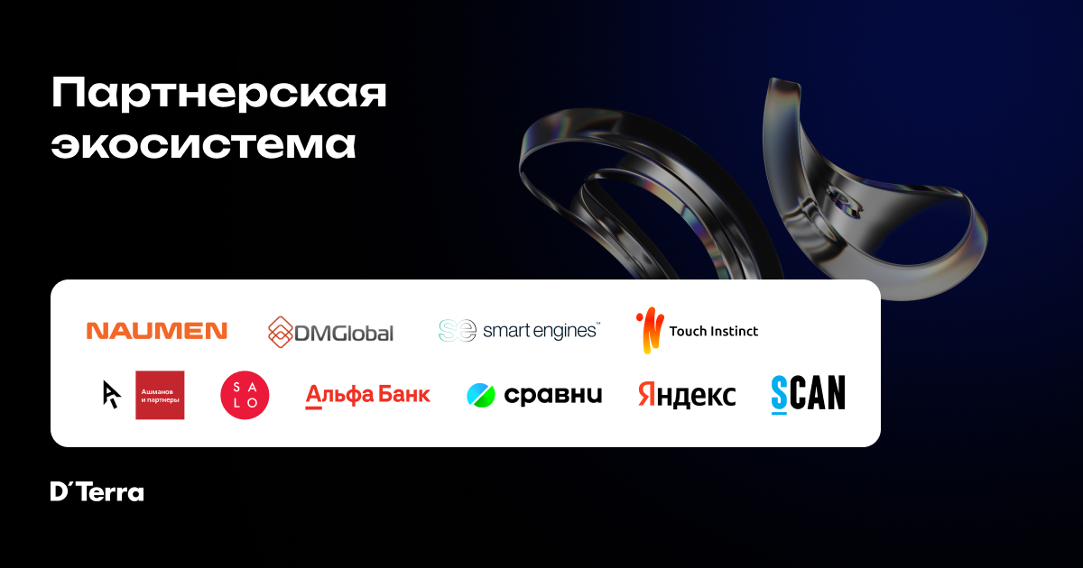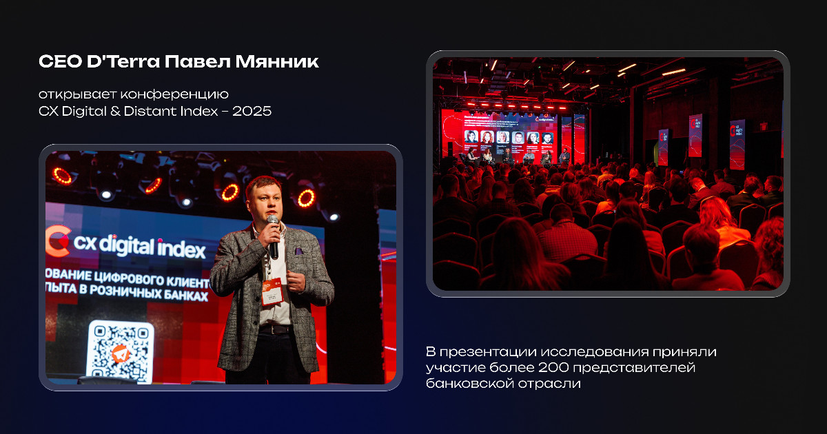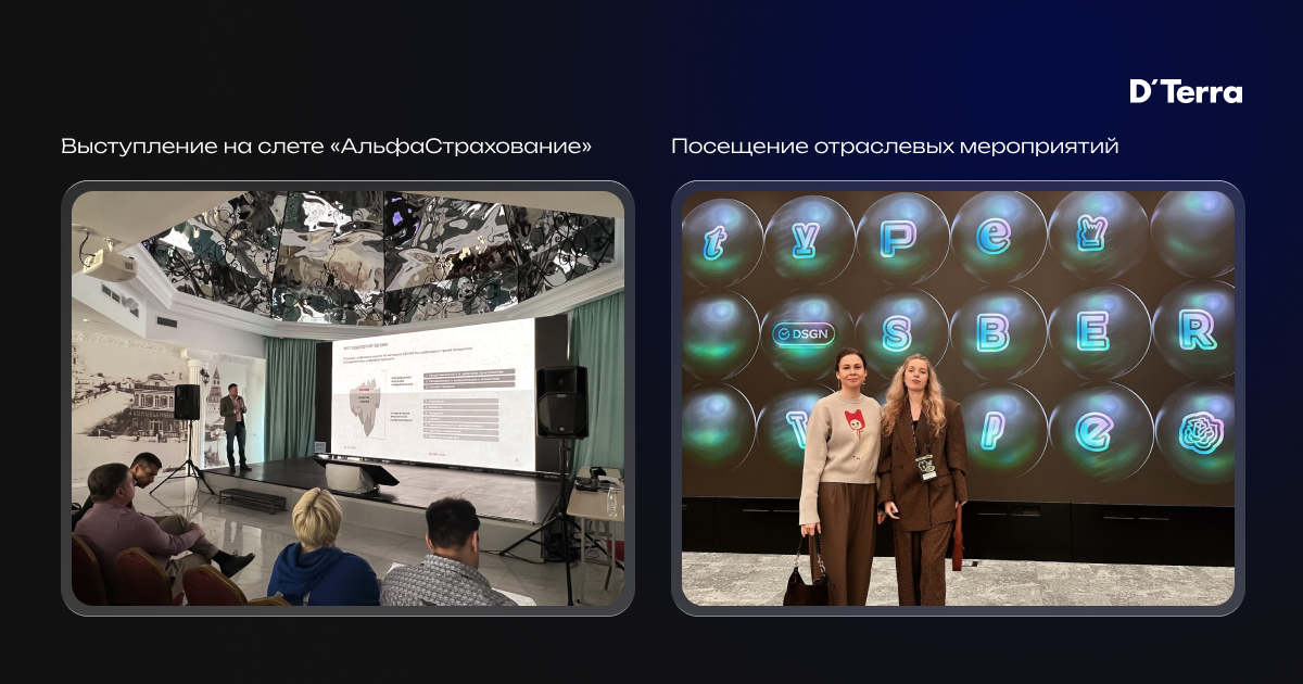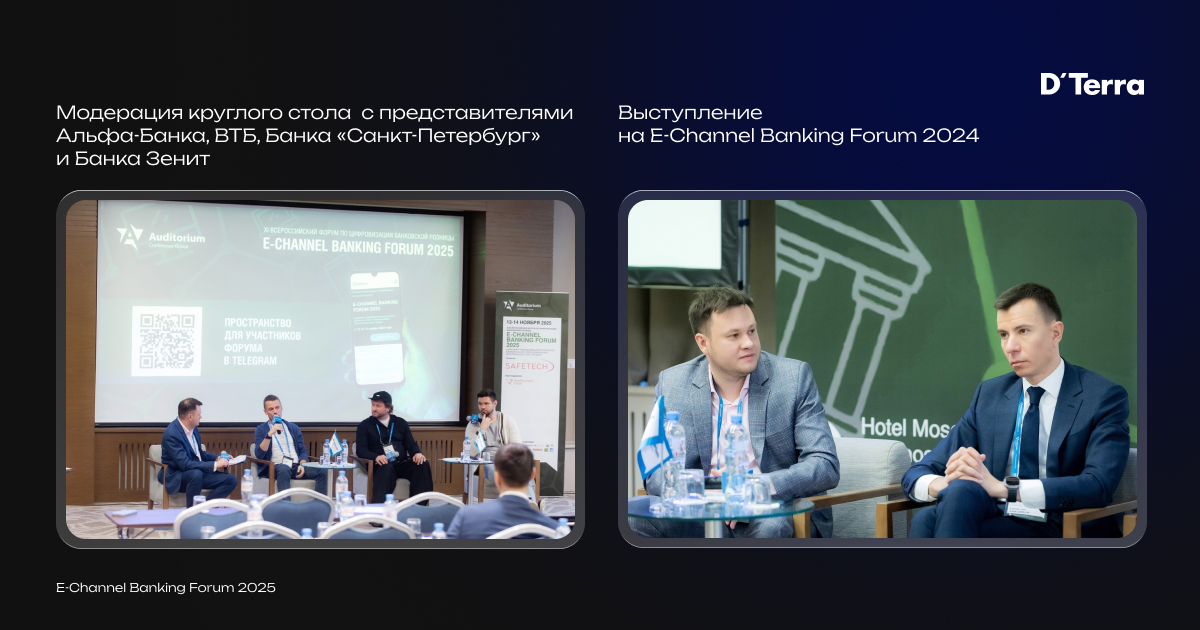 О доверии рынка к экспертизе D’Terra говорит наше участие в ключевых мероприятиях в качестве модераторов и докладчиков. Например, в 2025 году CEO D’Terra Павел Мянник модерировал круглый стол с представителями Альфа-Банка, ВТБ, Банка «Санкт-Петербург» и Банка Зенит на XI Всероссийском форуме по цифровизации банковской розницы E-Channel Banking Forum.