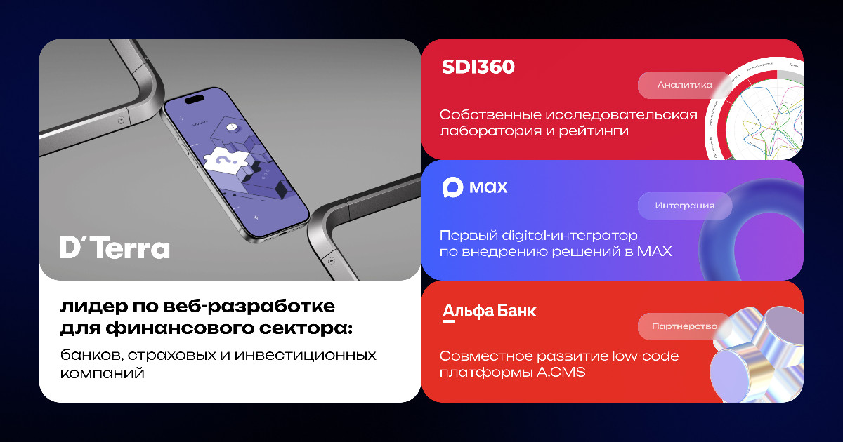 В 2025 году компания D'Terra первой среди агентств в России внедрила решение на платформе MAX. Развиваем стратегическое направление – создаем цифровые сервисы для финансовых компаний внутри мессенджера. Такой формат открывает новый канал взаимодействия с клиентами и формирует цифровой стандарт клиентского сервиса в отрасли.