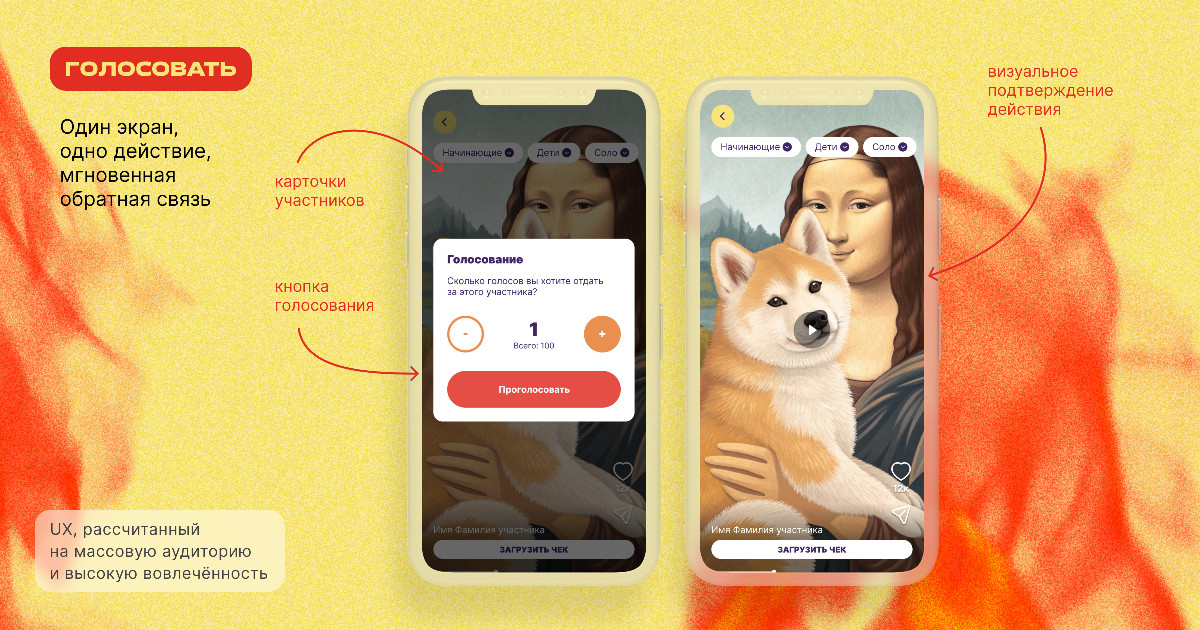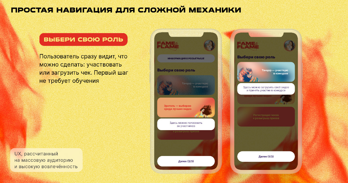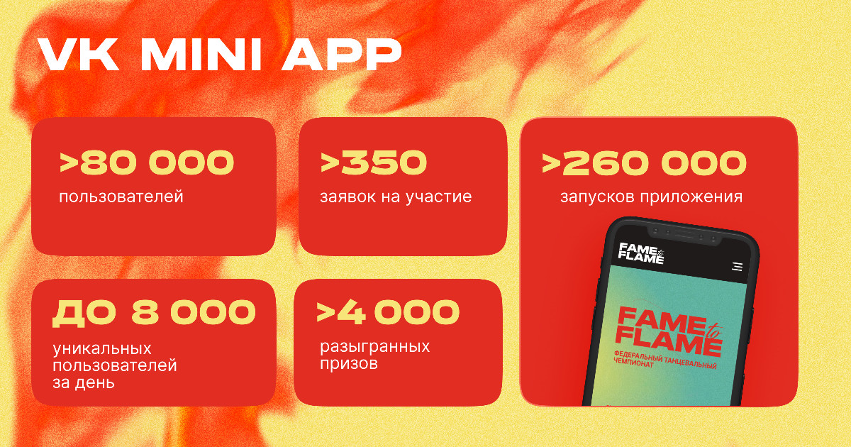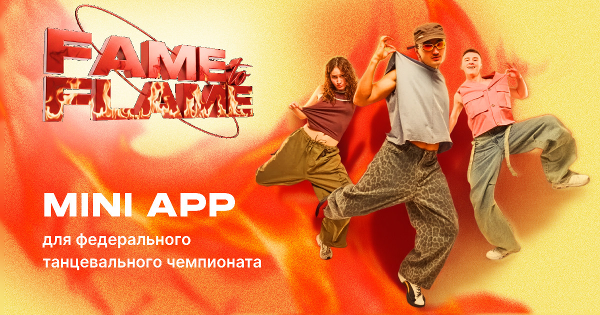 Fame to flame — федеральный танцевальный чемпионат. Задача проекта VK Mini app в рамках чемпионата — предоставить удобную платформу для регистрации чеков, загрузки танцевальных видео, голосования и проведения розыгрышей призов.