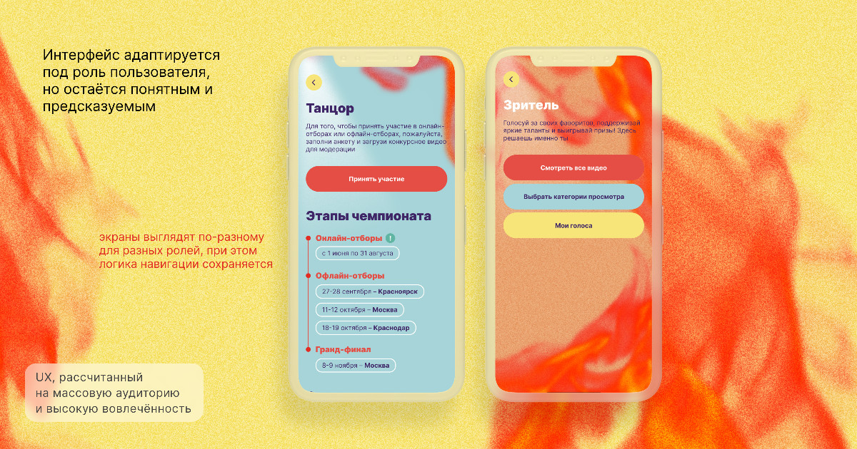 ✅ разработали удобный интерфейс с цветовым кодированием ролей, чтобы легче было понять, как работает конкурсная механика: где зарегистрироваться, как залить видео, где посмотреть призы.
