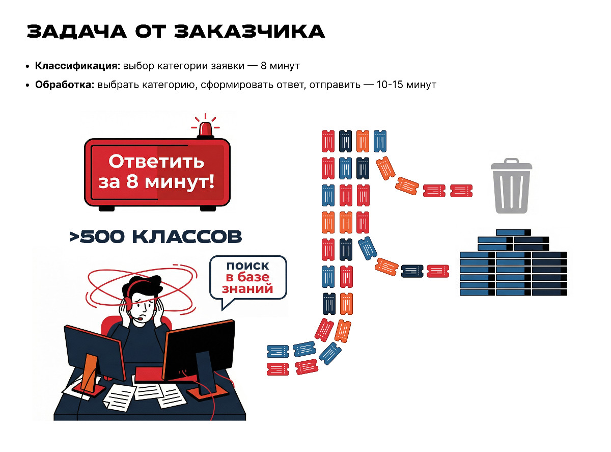 ✅ Автоматизировать классификацию обращений и сократить время обработки с 10 до 2 минут, создав масштабируемую архитектуру, работающую полностью внутри контура заказчика.