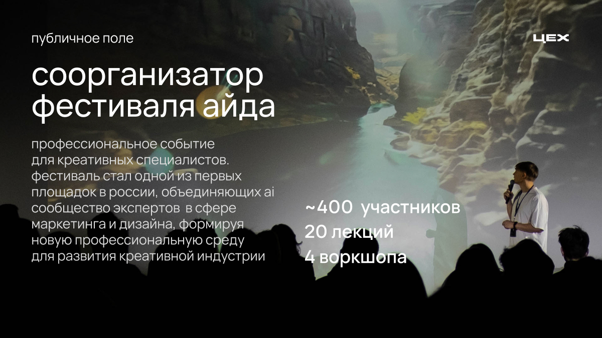 - Соорганизатор образовательного нейрофестиваля «Айда» — профессионального события для дизайнеров и креативных специалистов: