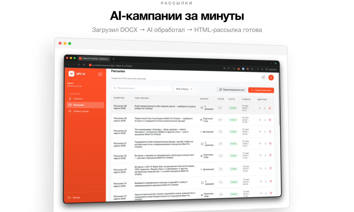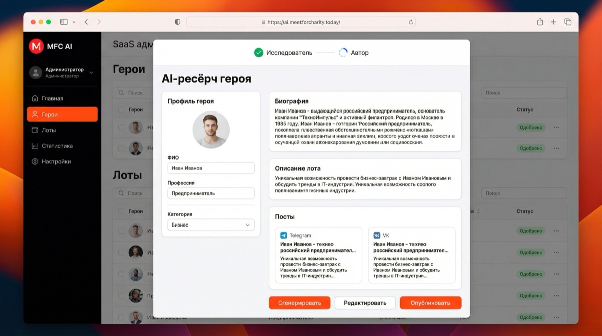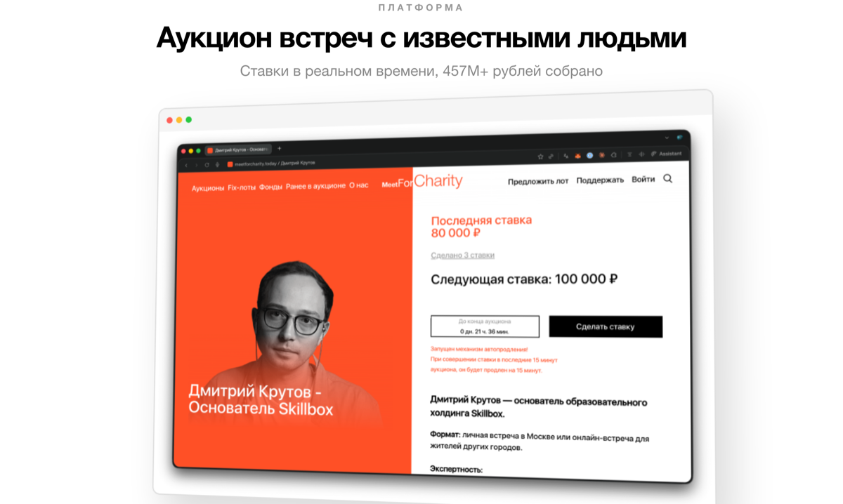 Meet for Charity — онлайн-аукцион благотворительных встреч с известными людьми. Проект с оборотом 120 млн ₽/год и десятилетней историей. Аукцион работает с 200+ благотворительными российскими фондами.