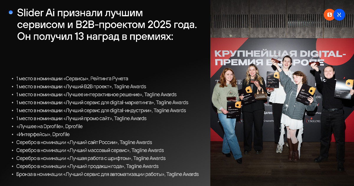 Также Slider Ai уже получили звание лучшего сервиса 2025 года по версии премии Рейтинг Рунета, 10 наград Tagline Awards 2025 (среди которых «Лучший B2B проект» и «Лучший сервис для digital-индустрии») и награды «Лучшее на Dprofile» и «Интерфейсы» по версии площадки Dprofile в 2026 году: