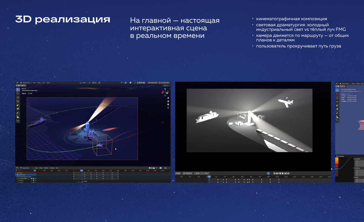 - синхронизировали 3D-пролёт со скроллом — пользователь буквально «прокручивает» путь груза.