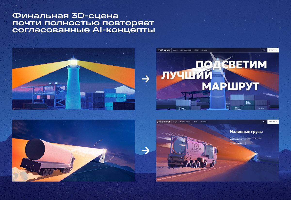 ❗️Важно: финальная 3D-сцена почти полностью повторяет концепты, собранные в AI и согласованные с клиентом.