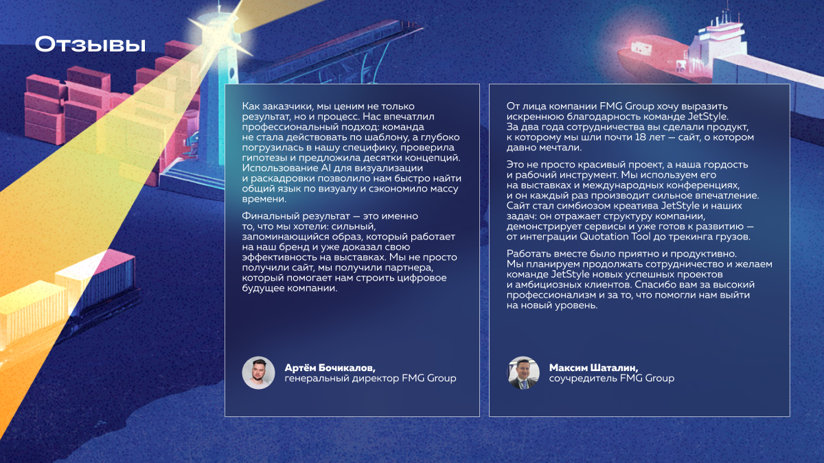 От лица компании FMG Group хочу выразить искреннюю благодарность команде JetStyle. За два года сотрудничества вы сделали продукт, к которому мы шли почти 18 лет — сайт, о котором давно мечтали.
