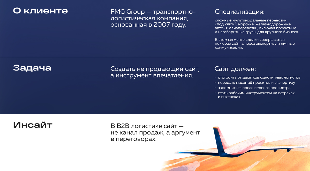 В этом проекте мы работали не с задачей «как сделать продающий сайт для логистической компании», а с задачей «как цифровой продукт может влиять на переговоры в сегменте, где сайты не продают».