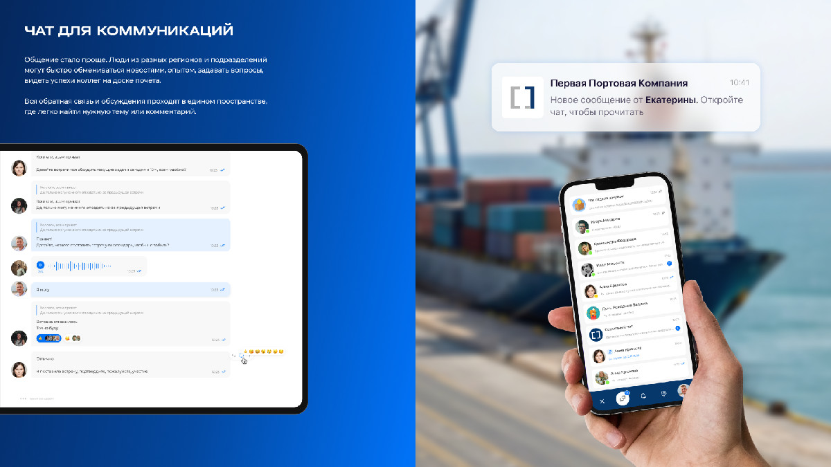 - Все сотрудники холдинга (4000+ человек), работающие в разных регионах и на разных должностях, переведены в единое цифровое поле. Разрыв между портами и центральным офисом нивелирован.