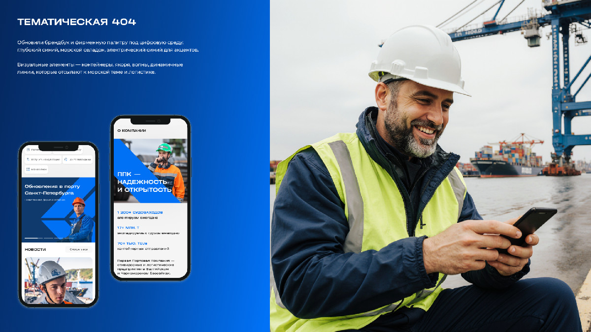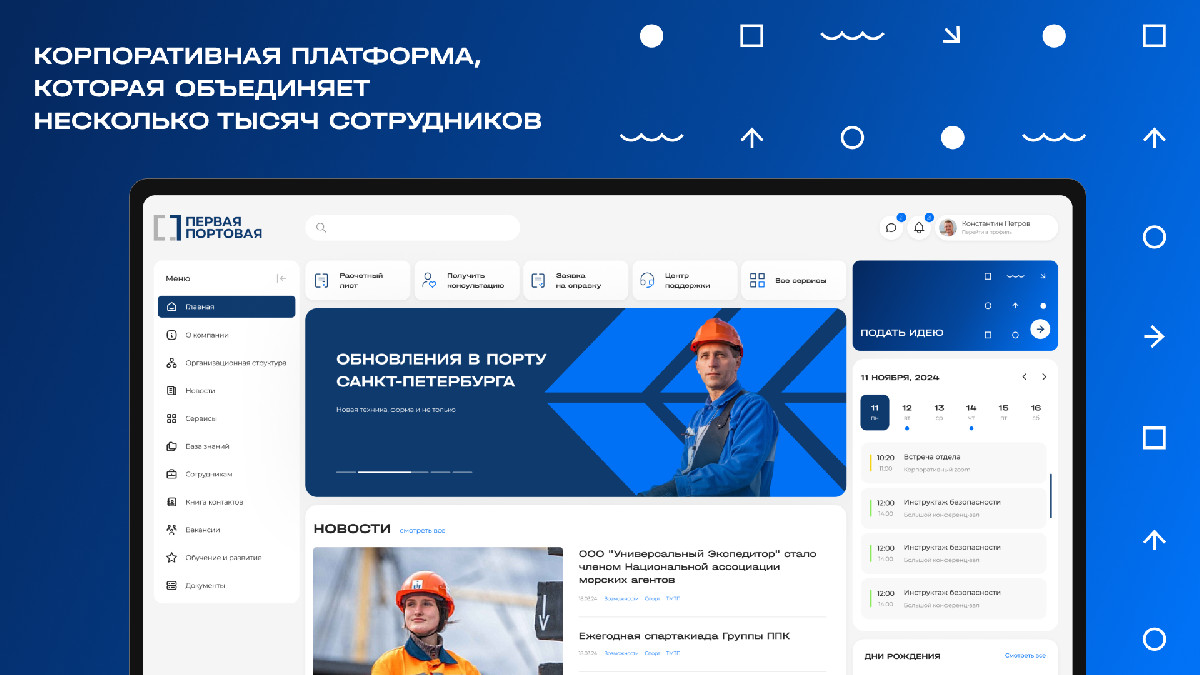 Визуальные элементы — контейнеры, якоря, волны — не только украшают интерфейс, но и делают навигацию интуитивной, помогая быстро ориентироваться среди множества разделов. Акцидентный шрифт и паттерны адаптированы для веба, поддерживают узнаваемость компании и делают портал «своим» для каждого сотрудника.