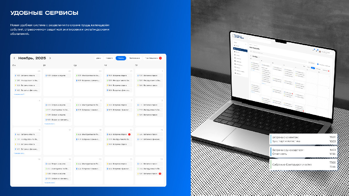 В обновлённом портале появились разделы с внутренними вакансиями, интерактивной доской почёта, историями сотрудников и династий. База знаний включает материалы по охране труда, календарь событий и справочник защитной экипировки. Информационная панель и персонализированные рекомендации помогают быстро находить нужные сервисы и материалы.
