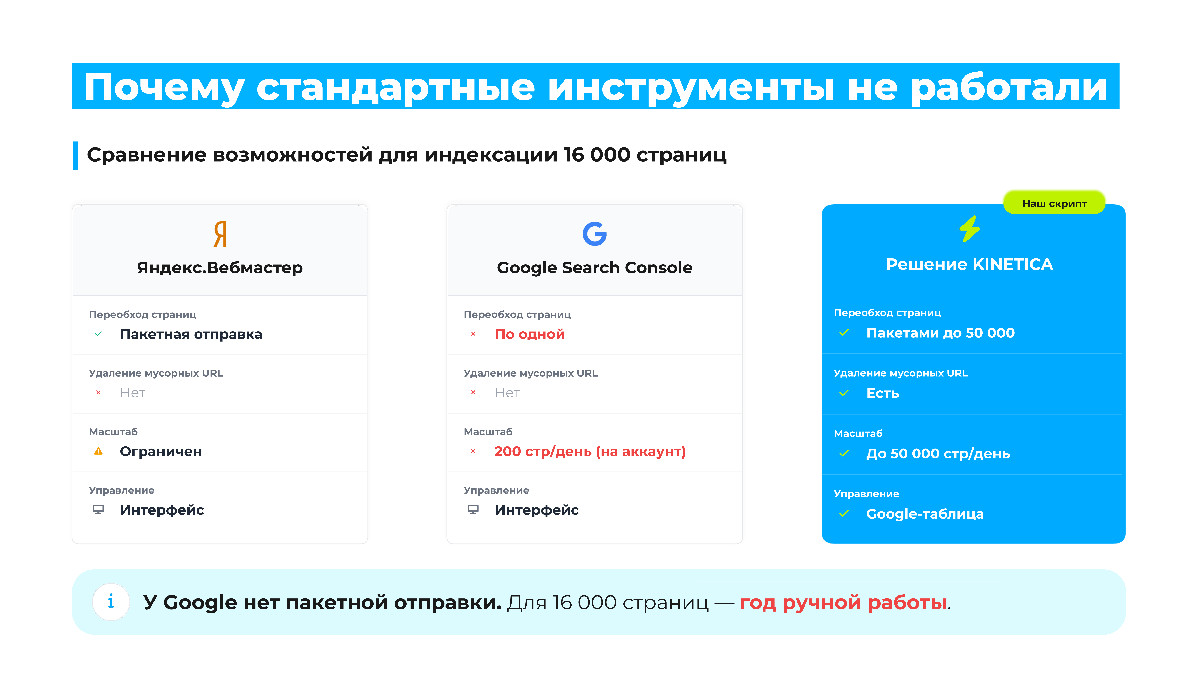 Кейс значим для рынка: многостраничные сайты — интернет-аптеки, магазины, каталоги — сталкиваются с этой проблемой повсеместно, особенно после редизайнов. Скрипт уже работает на десятках проектов агентства. Это не разовое решение под одного клиента — это инструмент, который закрывает системный пробел в работе с Google.