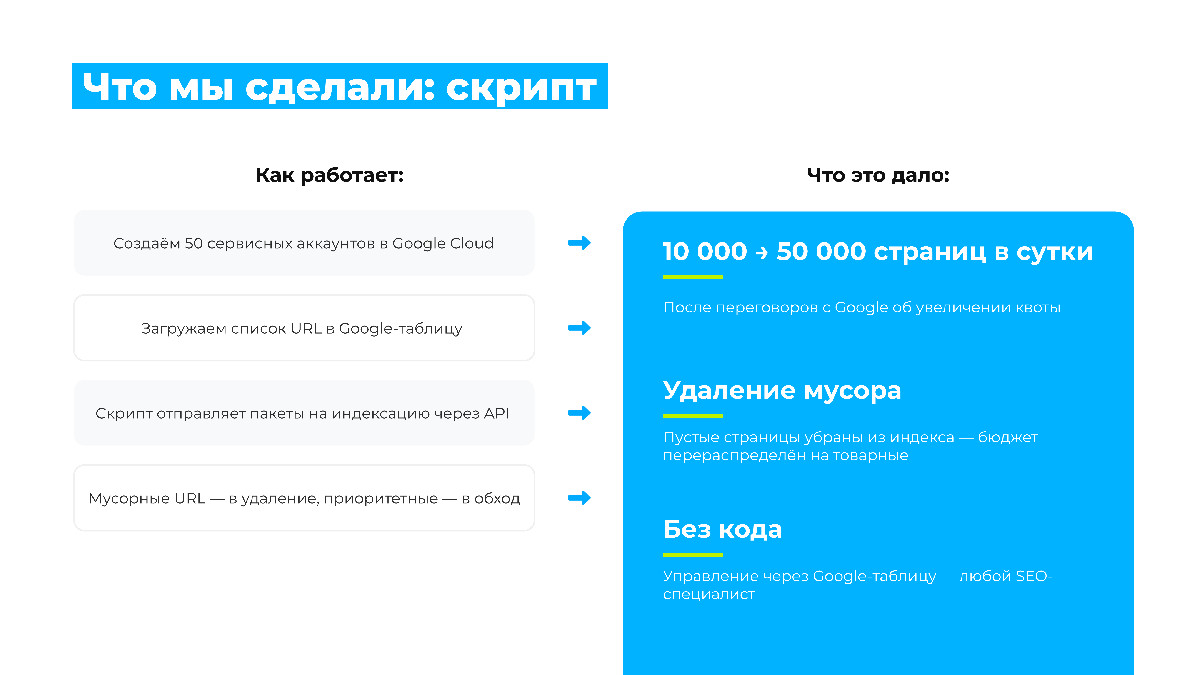 Этап 2. Собственный скрипт на базе Google Indexing API. Мы разработали скрипт, который отправляет URL группами на принудительную индексацию — вместо ручной подачи по одной странице. Один аккаунт даёт лимит 200 страниц в день. Мы подключили 50 аккаунтов — это 10 000 страниц в сутки. Дополнительно договорились с Google об увеличении квоты до 50 000 страниц.