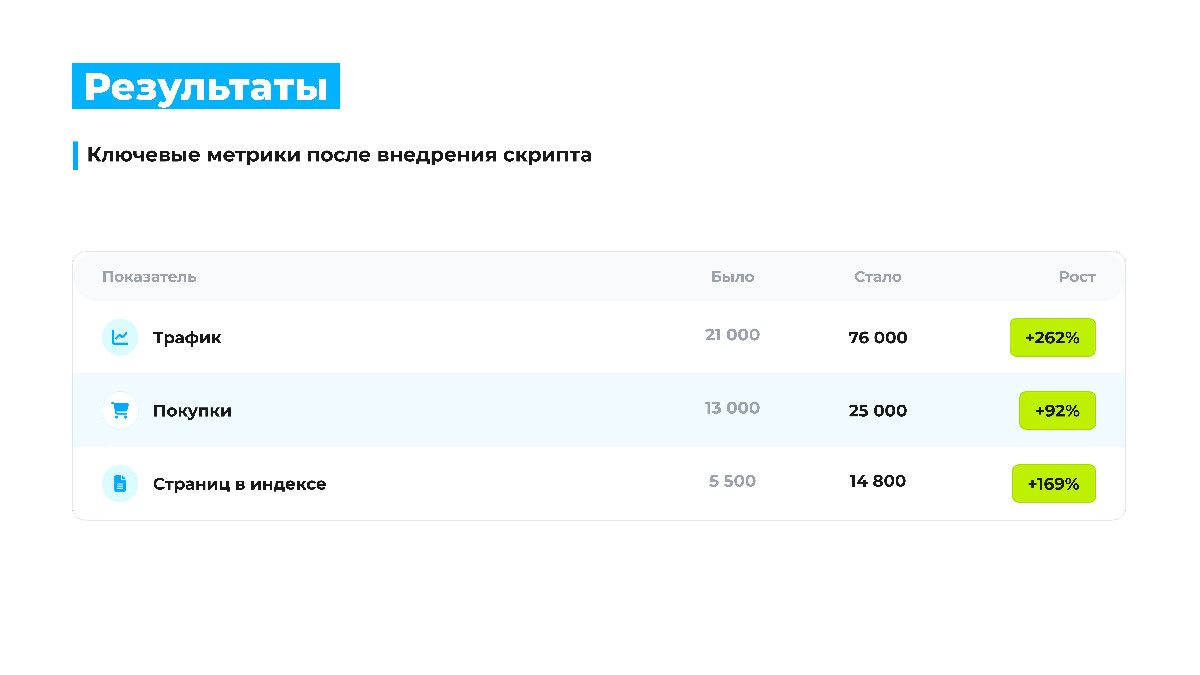 Масштабируемость решения: скрипт применили на других проектах: интернет-магазин сварочного оборудования — индексируемые страницы выросли с 340 до 640 за один день; информационный портал — удалено 30 000 нерелевантных страниц, позиции выросли.
