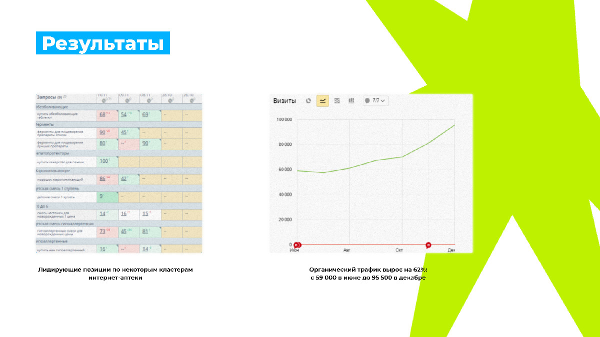 Главный результат: органический трафик вырос на 62% — с 59 000 визитов в июне до 95 500 в декабре.