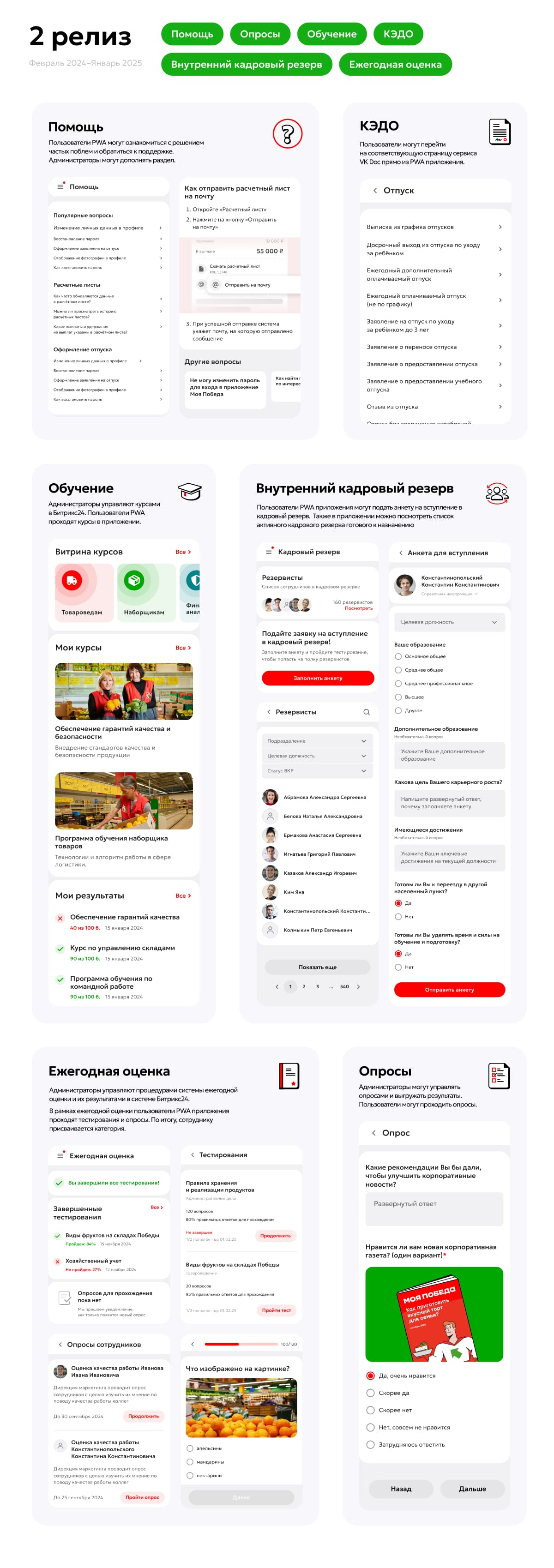 За время работы над приложением нам удалось выстроить с командой ТС ПОБЕДА по-настоящему эффективное партнёрство. Сейчас мы продолжаем совместное развитие проекта: расширяем функциональность, адаптируем платформу под новые сценарии для сотрудников и HR-команды.