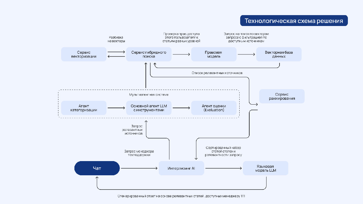 - Интеллектуальный симбиоз человека и ИИ: ИИ берет на себя рутинный поиск информации и подготовку ответа, а специалист проверяет данные и принимает финальное решение. Это позволяет использовать экспертизу сотрудников максимально эффективно.