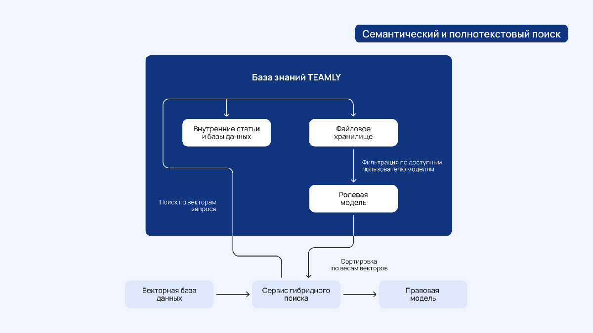 Главной задачей проекта стало повышение эффективности внутренней технической поддержки за счёт внедрения умного поиска по корпоративной базе знаний. Нужно было ускорить обработку запросов сотрудников и автоматизировать ответы на типовые вопросы с помощью AI-ассистента, работающего на базе технологии RAG и использующего только внутренние знания компании в платформе TEAMLY.