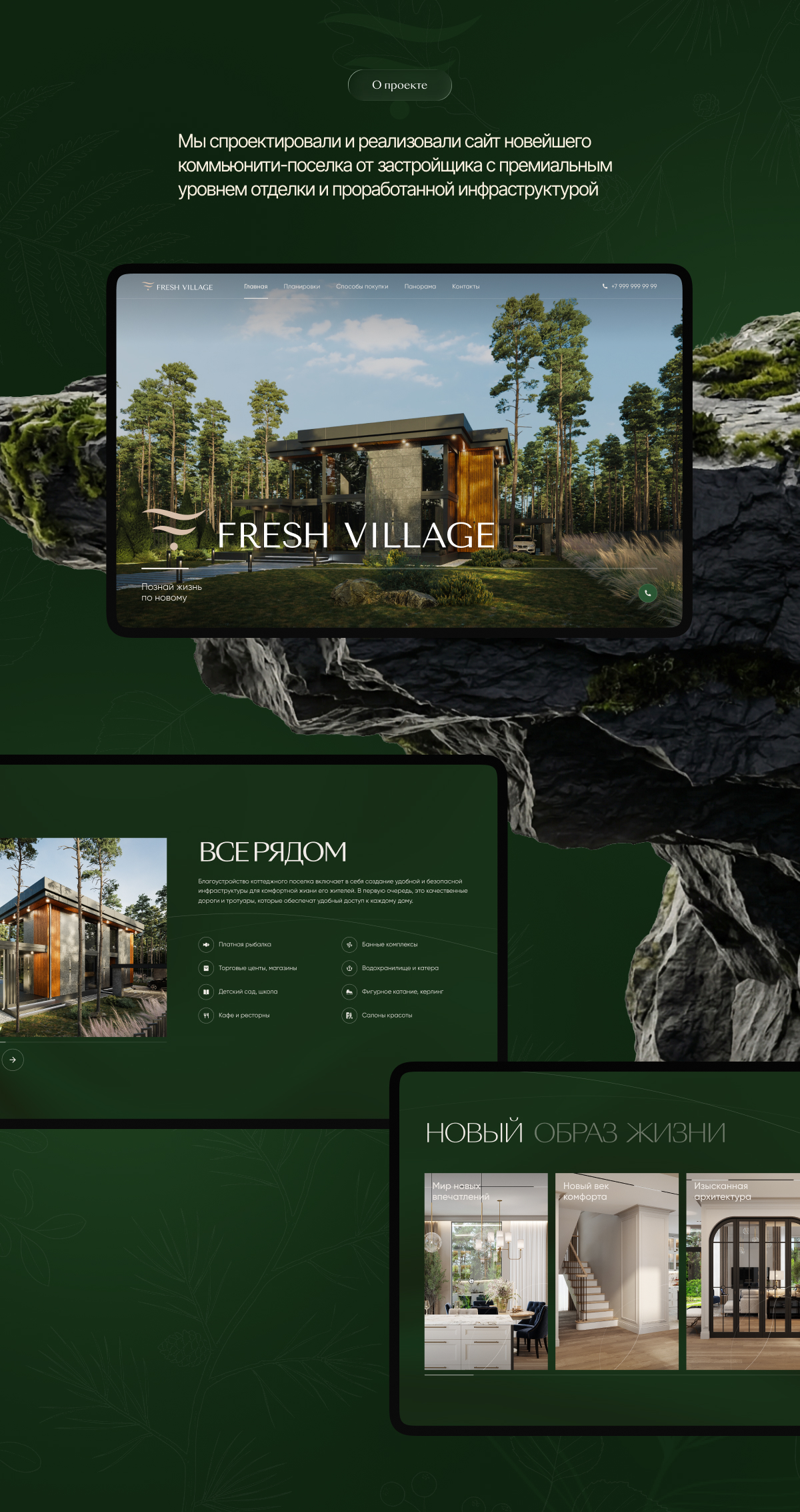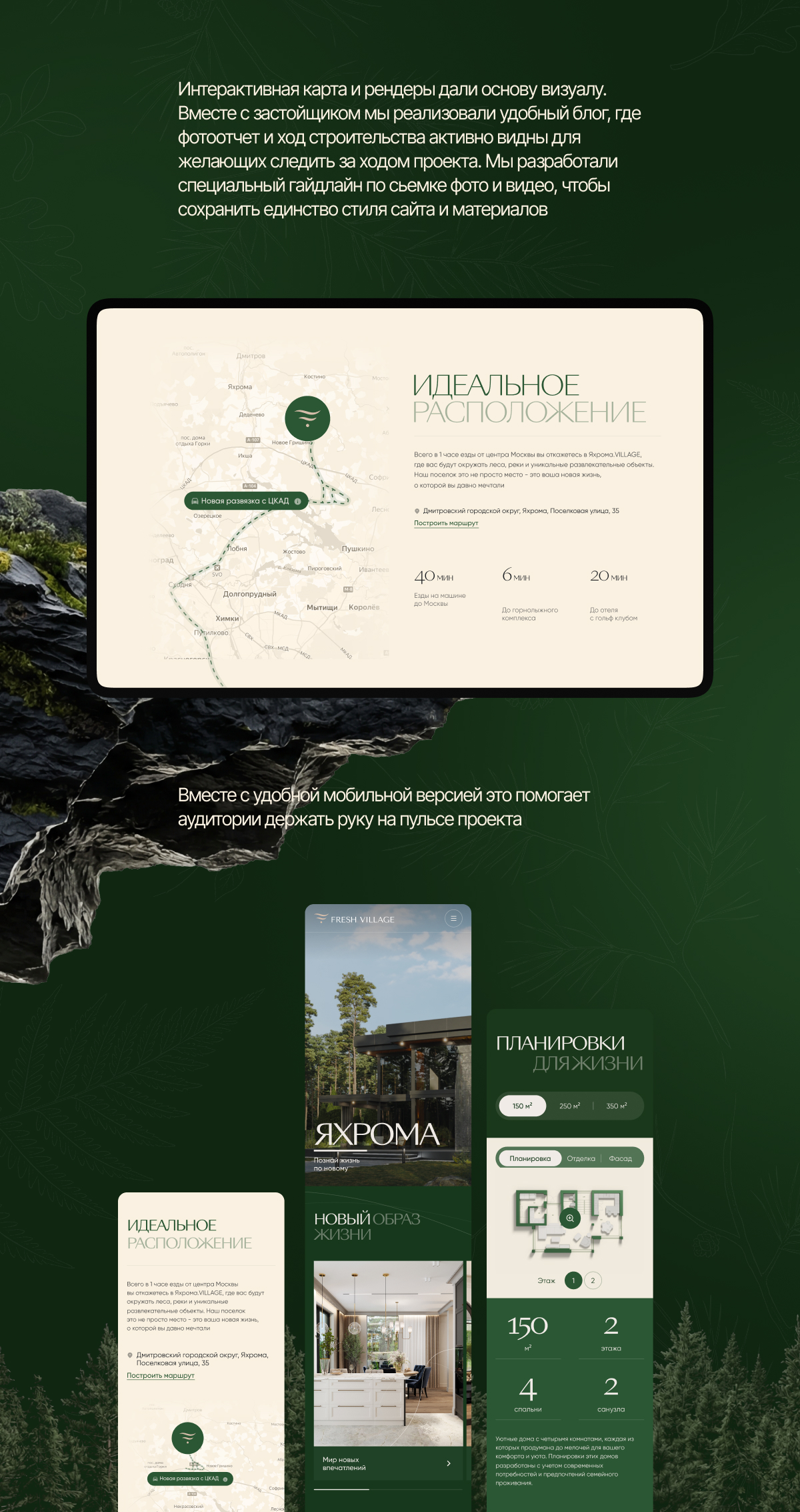Таким образом, перед нами стояла задача не только разработать сайт и визуальные материалы, но и создать целостный образ Fresh Village как места, где начинается новая жизнь в окружении природы и комфорта. Мы понимали, что от успешного решения этих задач зависит будущее всего проекта.