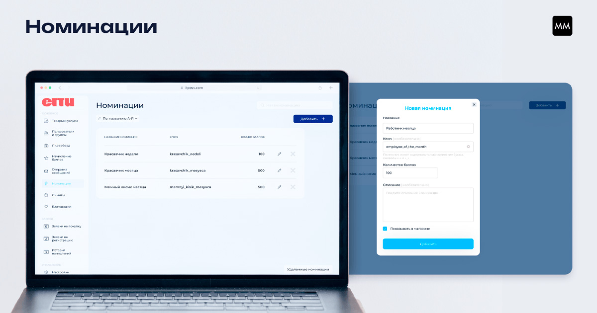 Сами номинации находятся в постоянном доступе на платформе. Теперь не нужно печатать никаких плакатов и вырезать фигурки из бумаги. Начислять внутреннюю валюту можно также из админ панели: нужно только выбрать сотрудника и номинацию, за которую он получает баллы.