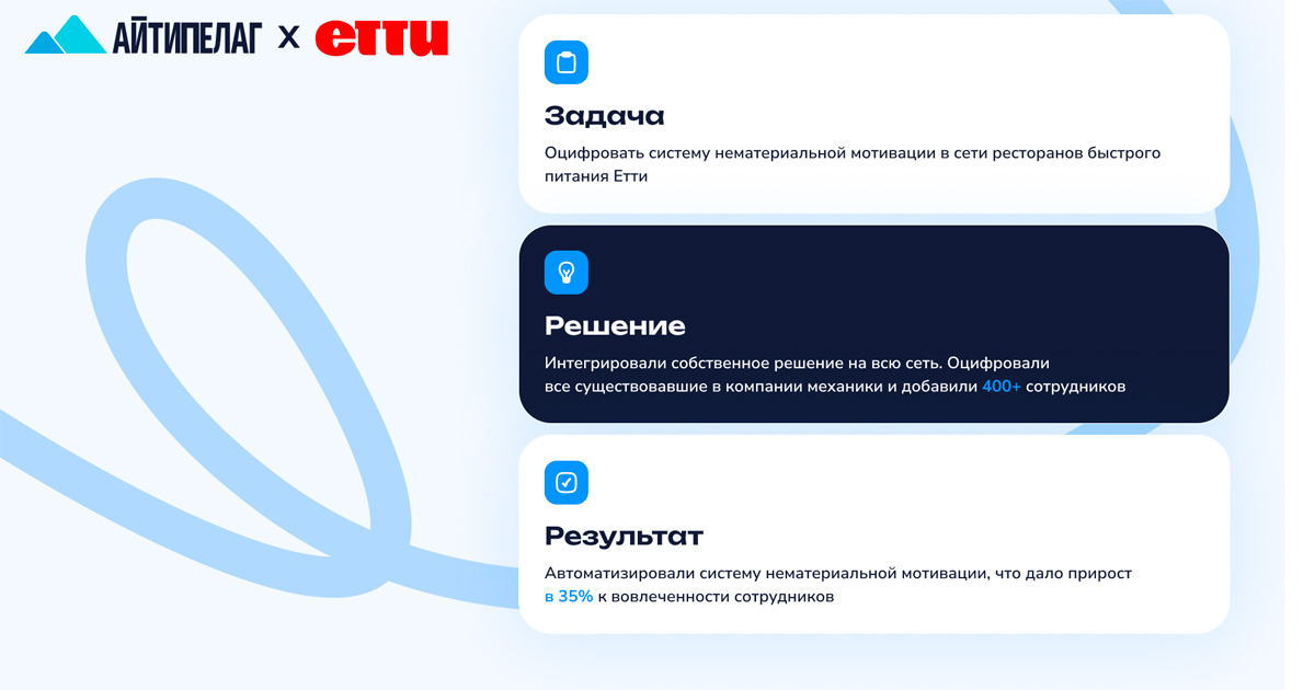 Мы рады, что в нужный момент встретили команду Айтипелага с их готовым решением. Ребята работают четко и не душно, во всех коммуникационных чатах только положительный вайб. Очень довольны, что обрели такого цифрового партнера.