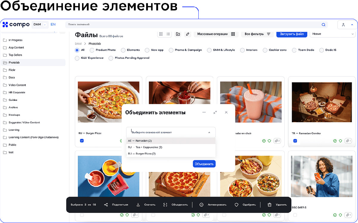Отдельным направлением стала работа с качеством данных. Проблема дублирования и фрагментации контента была решена за счёт механизма объединения элементов, который позволяет консолидировать файлы, теги и метаданные в единый канонический объект. Это стало важным шагом в сторону выстраивания системного подхода к управлению данными внутри DAM и повышения их достоверности.