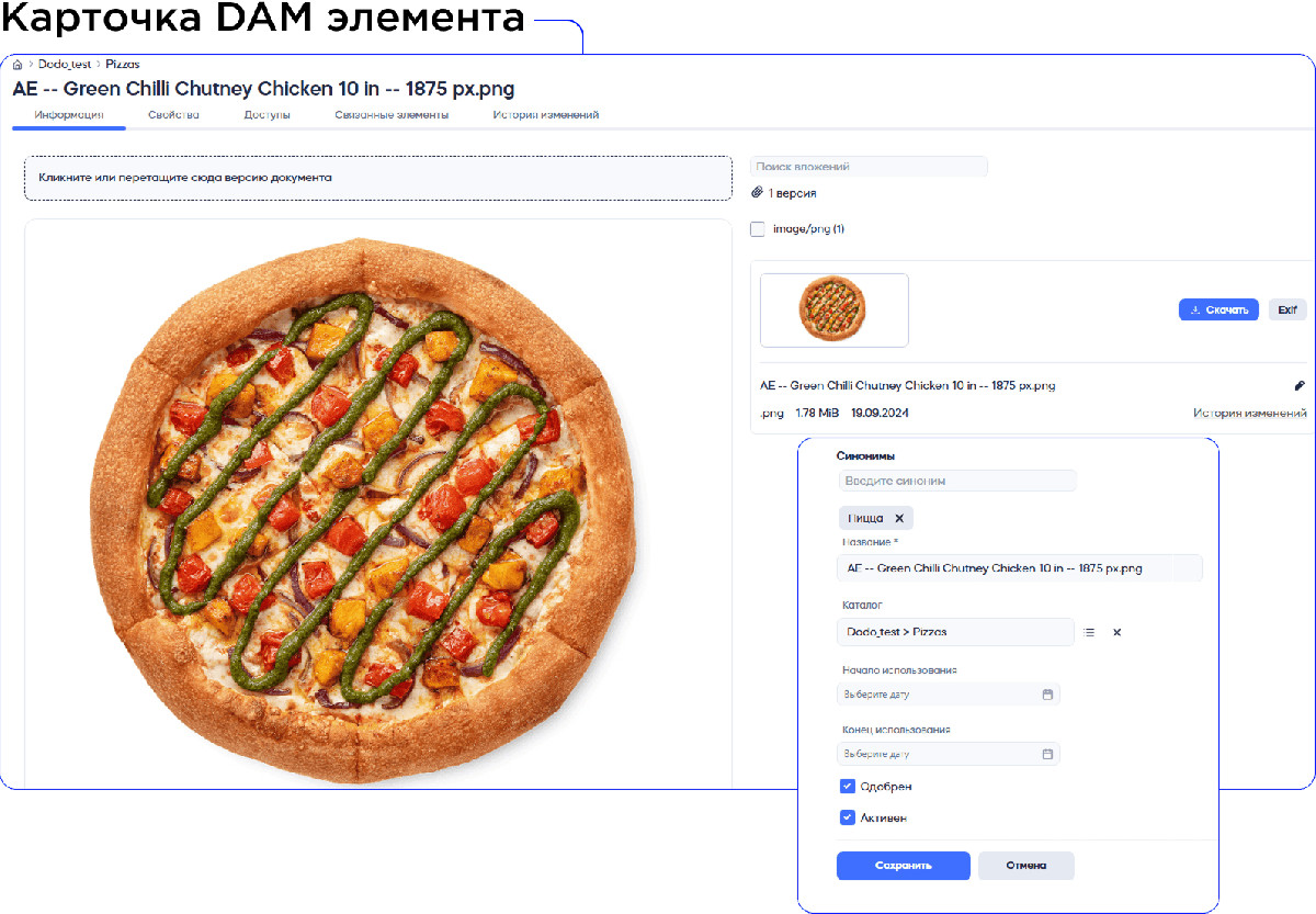 Дополнительно была переработана логика работы с отдельными элементами через карточку DAM-объекта. Каждый файл стал полноценной управляемой сущностью с набором атрибутов, версий, сроков использования и гибкой системой прав доступа. Такой подход позволил структурировать контент и сделать его пригодным для масштабирования, интеграций и дальнейшей аналитики. По сути, произошёл переход от хранения файлов к управлению контентными единицами как бизнес-активами.
