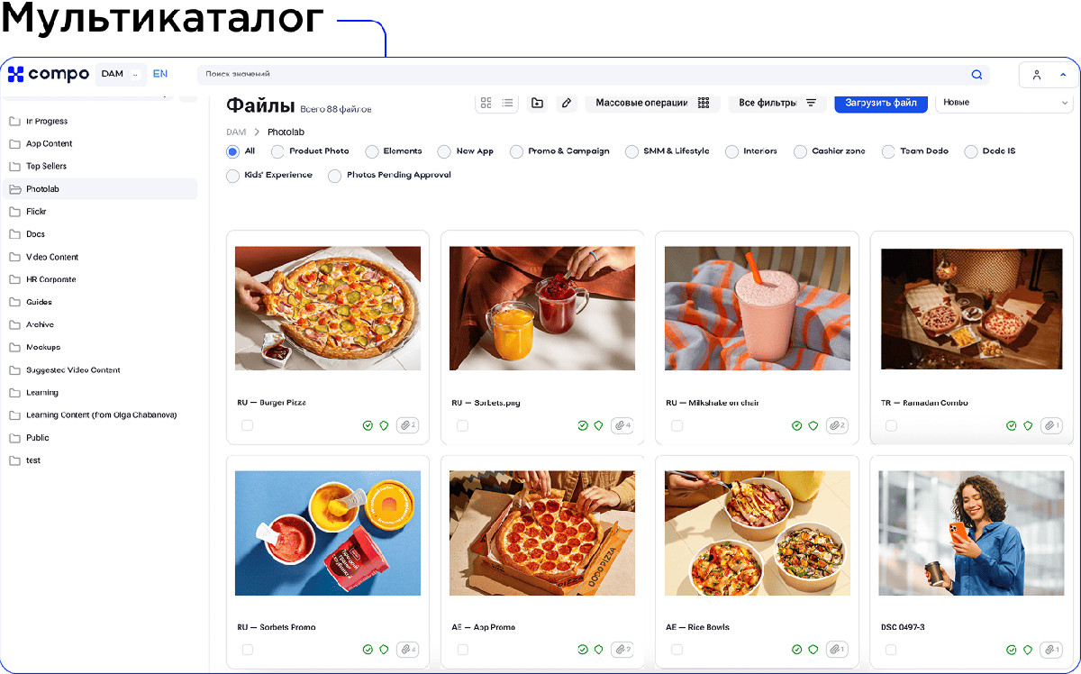 Одним из ключевых решений стала реализация мультикаталога, который позволил отказаться от дублирования файлов и перейти к модели единого источника правды. Один и тот же медиаобъект может использоваться одновременно в разных бизнес-контекстах — например, в маркетинговых кампаниях и материалах для франчайзи — без создания копий. Это существенно упростило навигацию, снизило количество ошибок и обеспечило консистентность использования контента во всей сети.