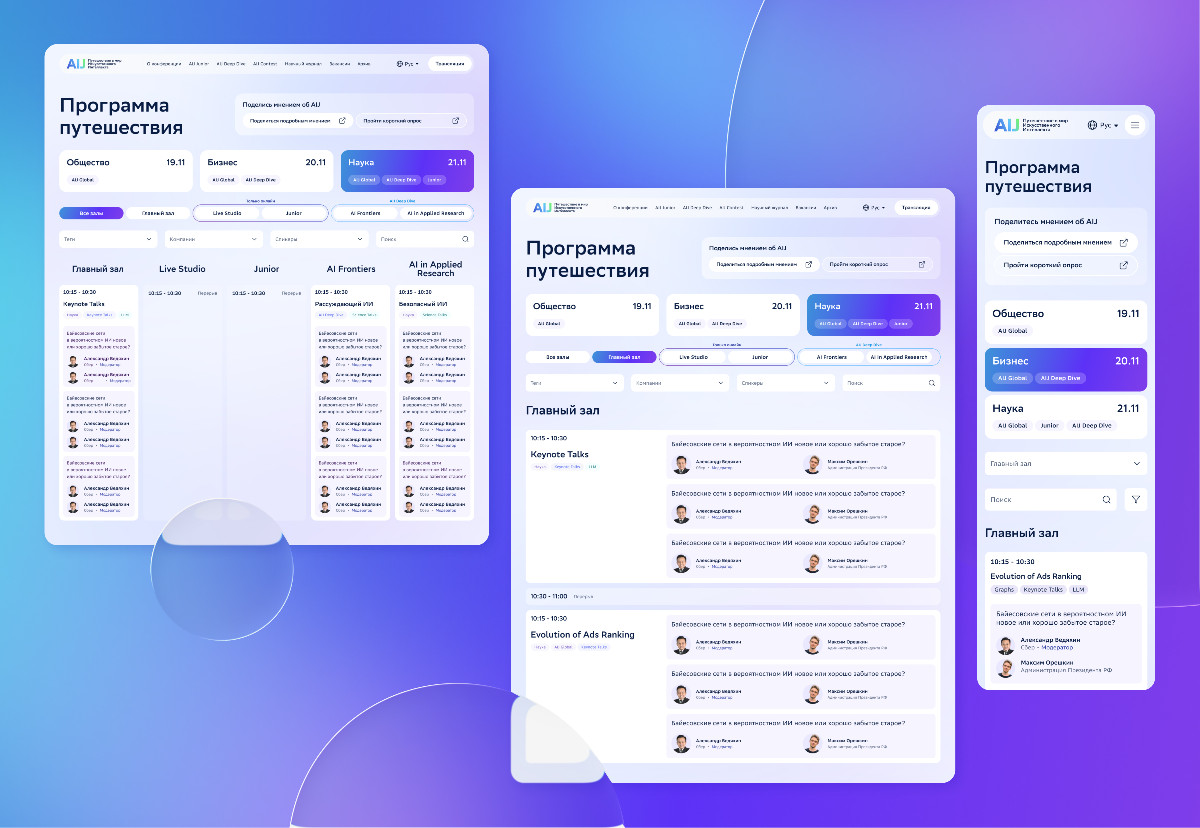 AI Journey — это десятки выступлений в день и 5 параллельных залов. Мы спроектировали программу на сайте так, чтобы пользователь мог быстро ориентироваться в потоке докладов. Для этого: