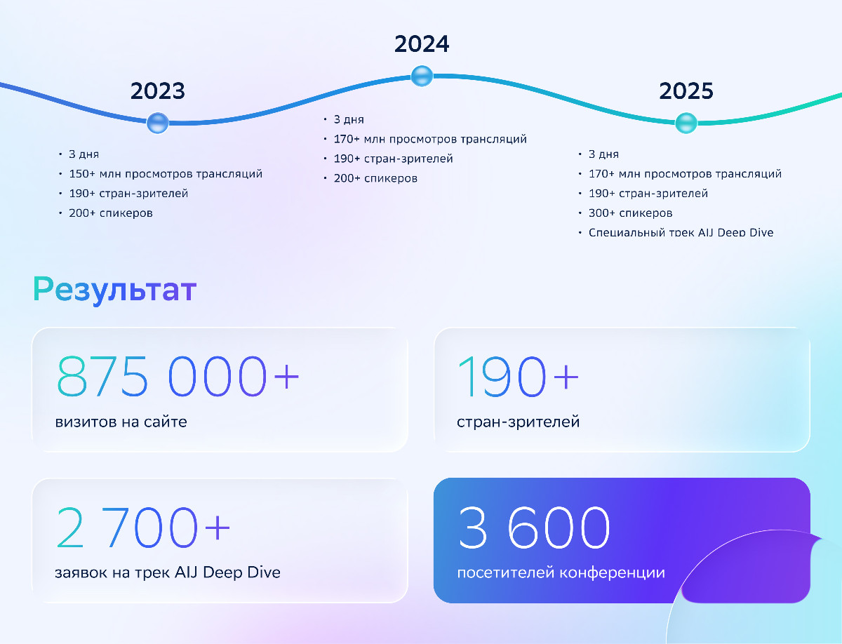 В 2025 году мероприятие прошло в юбилейный, десятый раз. Программа стала масштабнее, а формат — более открытым. Впервые появилась возможность присоединиться к конференции не по приглашению, а через заявку на открытый трек AIJ Deep Dive.