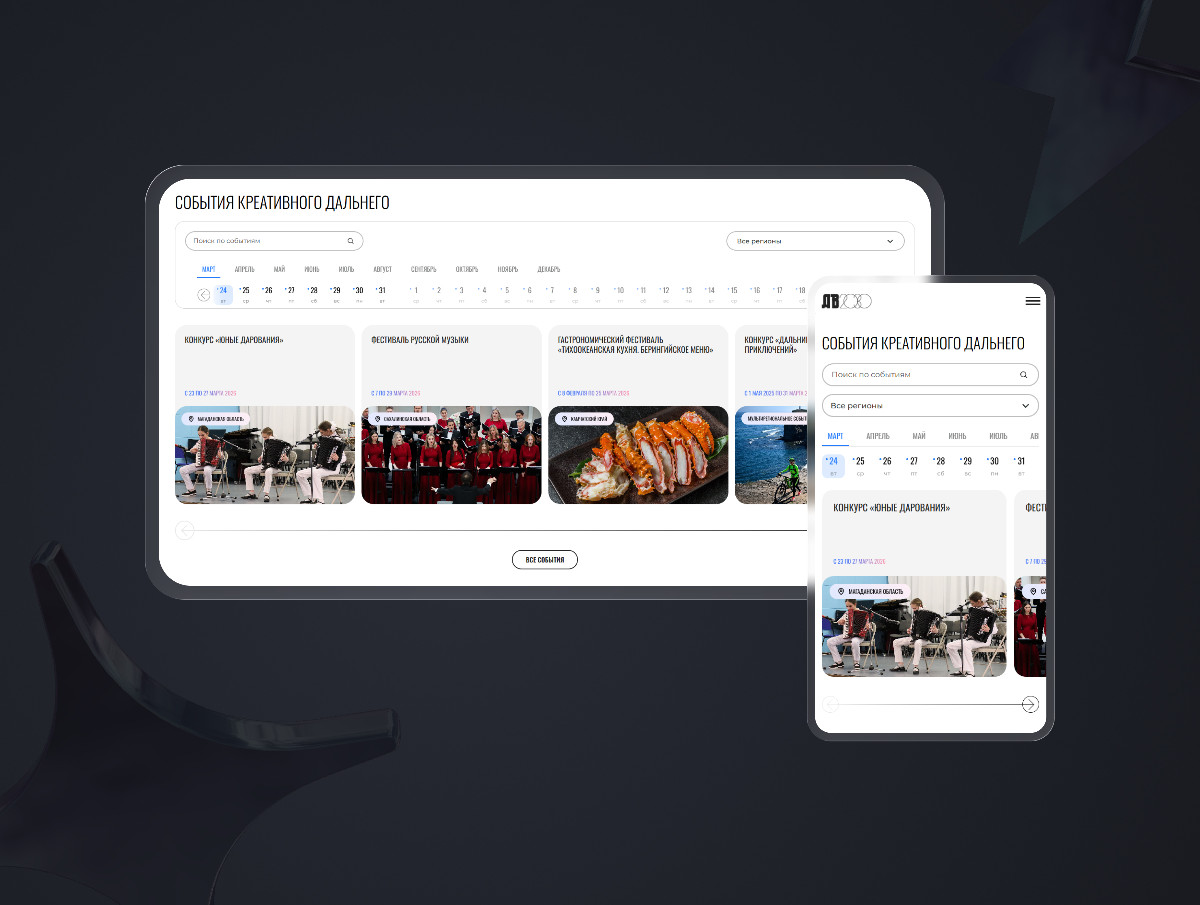 Еще одним ключевым элементом платформы стал календарь событий Дальнего Востока. Изначально делали его для дальнийвосток2030.рф на JavaScript с использованием Nuxt 3 и Swiper, но значительно расширили базовую функциональность.