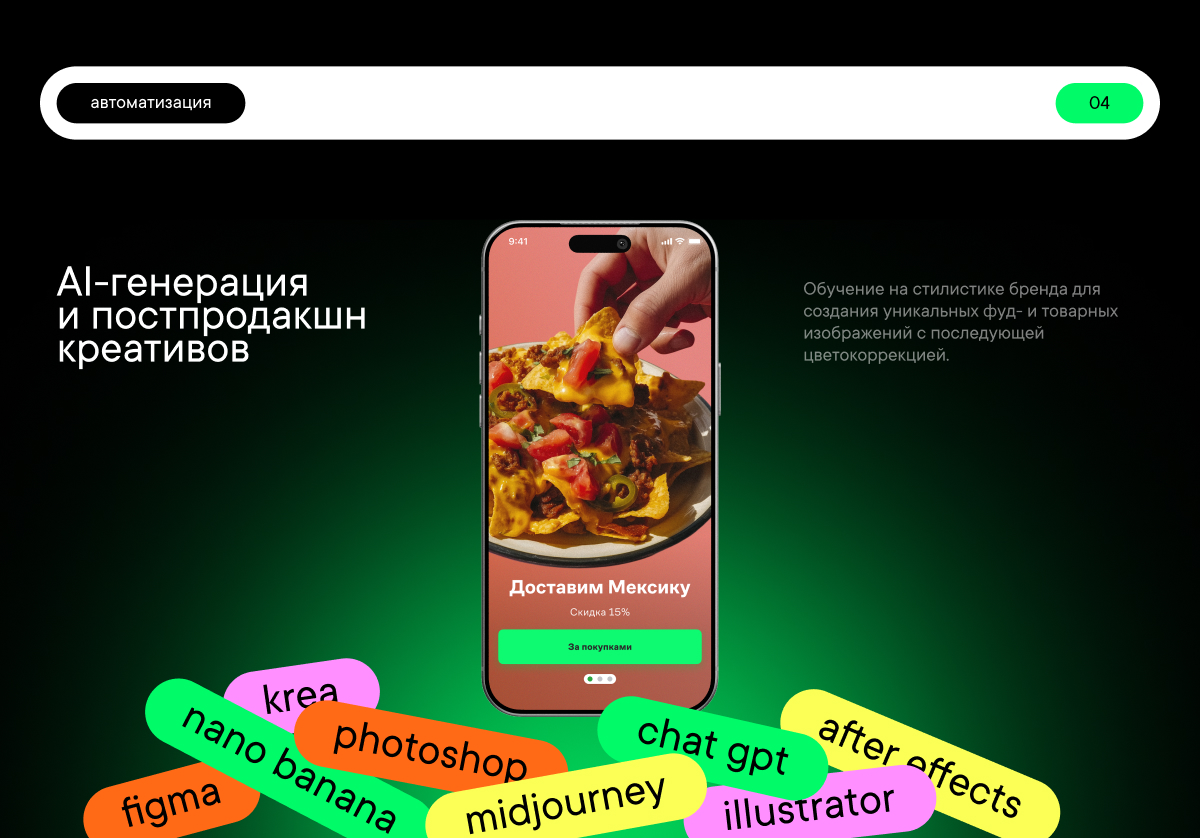 - AI-генерация и постпродакшн: обучение нейросетей (Midjourney) на стилистике бренда для создания уникальных фуд- и товарных изображений с последующей цветокоррекцией;