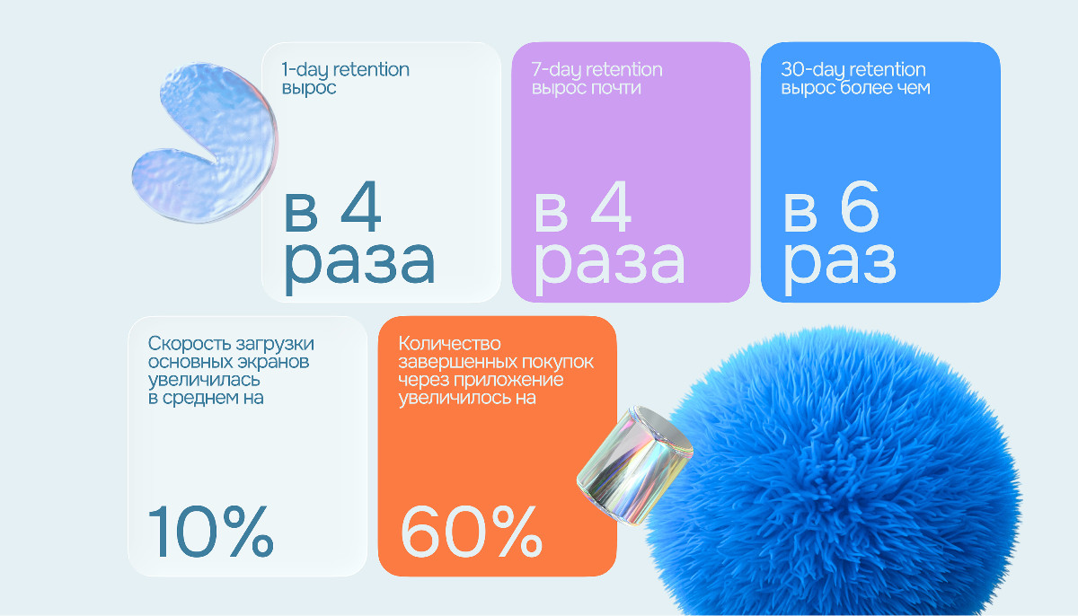 - Повышение конверсии. Благодаря оптимизированной архитектуре и обновленному UX количество завершенных покупок через приложение увеличилось на 60%.